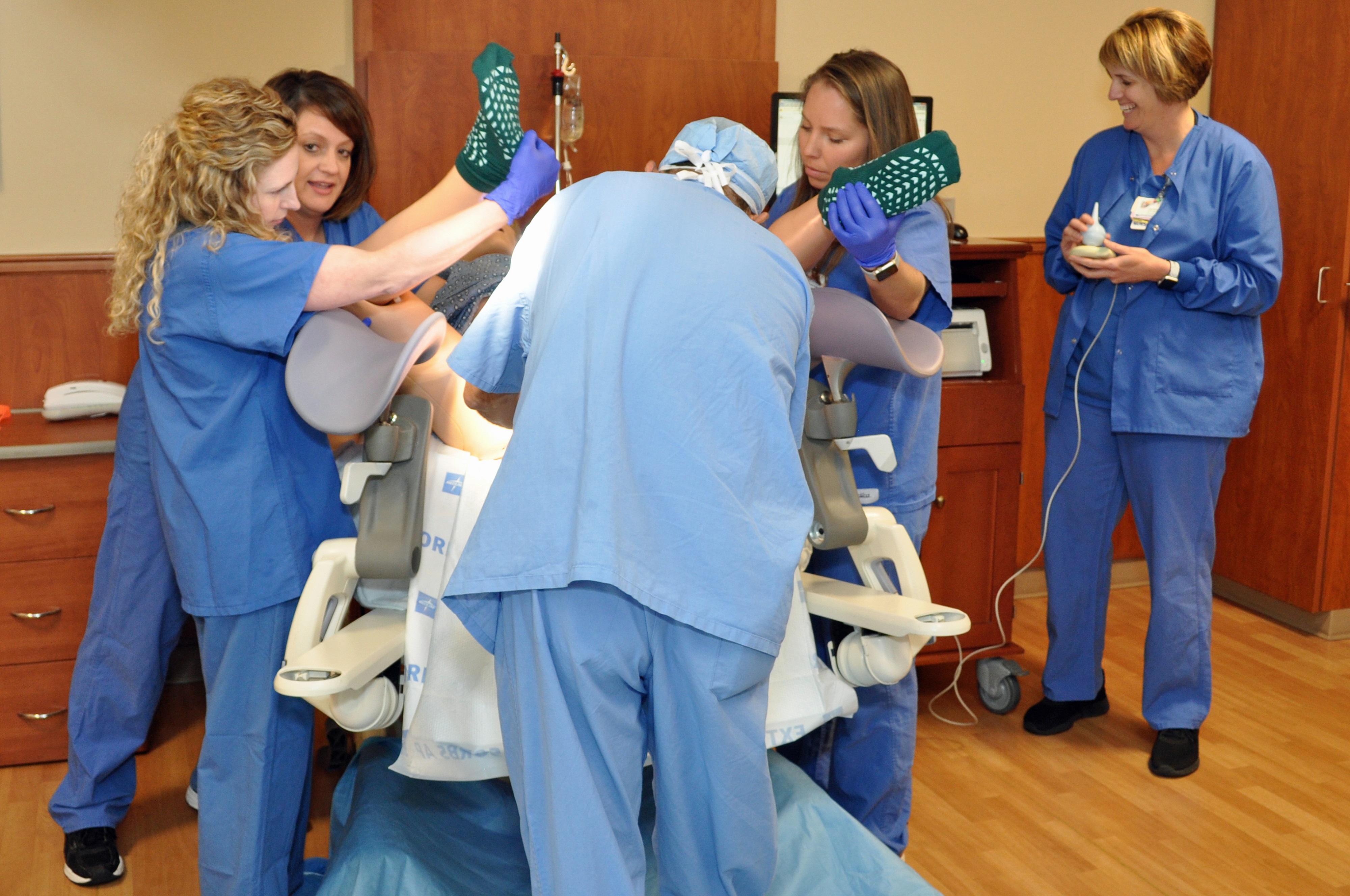 Members of St. Mary's Family Birth Center staff and Dr. Kausshik Shah use a mannequin to practice safely deliverying a baby whose shoulder is stuck inside the birth canal.